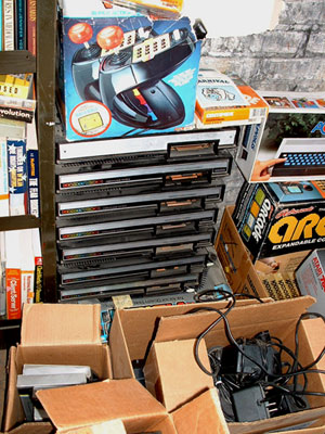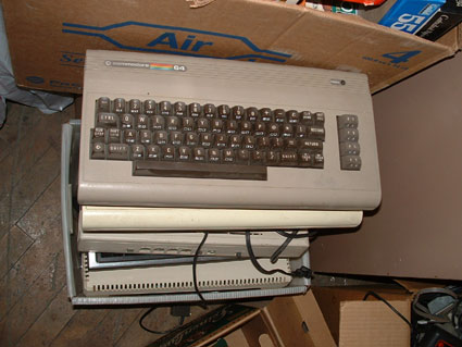 peccaui: Due the the sheer amount of obsolete entertainment available, we had to leave some stuff behind. Here's a stack of Commodore 64 keyboards. Underneathe them was an older Atari computer and a Texas Instruments computer. Wowza.
