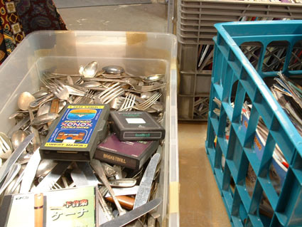 peccaui: Right before checking out of our final thirft store we happend upon these sensibly placed Atari 2600 cartridges - placed on top of a box of silverware and to the right of a sizable crate brimming with gay porn. And so this week ends with despair and an increased lack of faith in humanity - just as it should.
