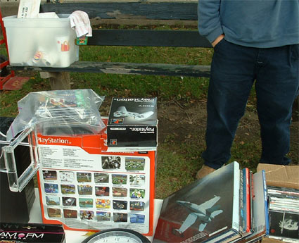 peccaui: This man (yes, the one standing confidently next to his 'wares') wanted something like $90 for this Playstation with five horribly outdated sports games. Oh and a second controller! It's about time to start carrying around a recent Gamestop ad to enlighten these 'proprieters' as to just how little their banged up piece of crap Playstation 'classic' is worth.